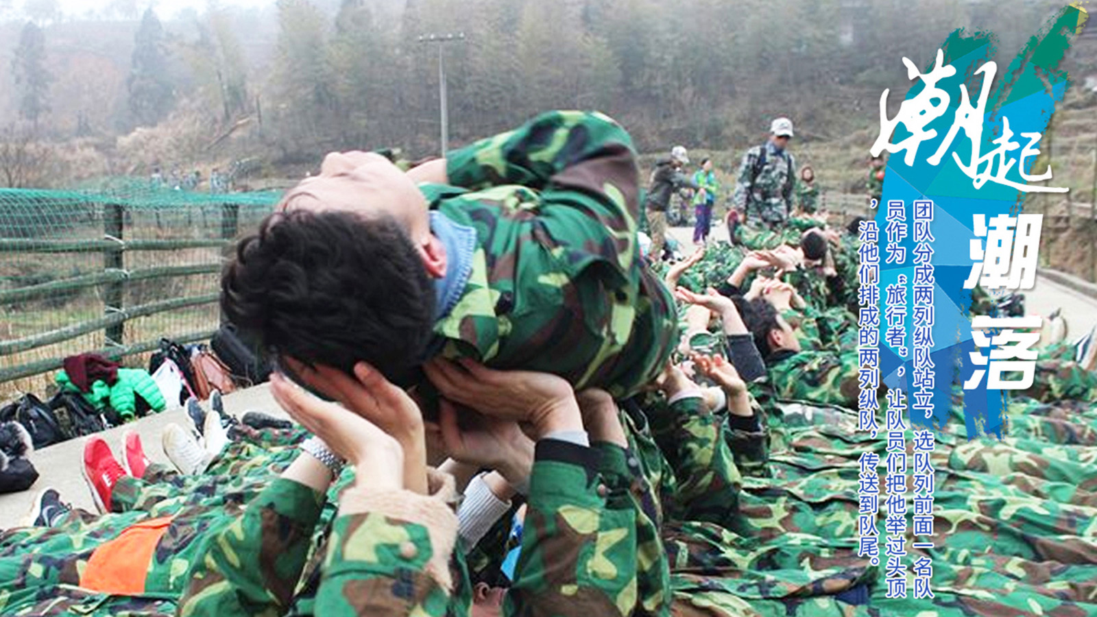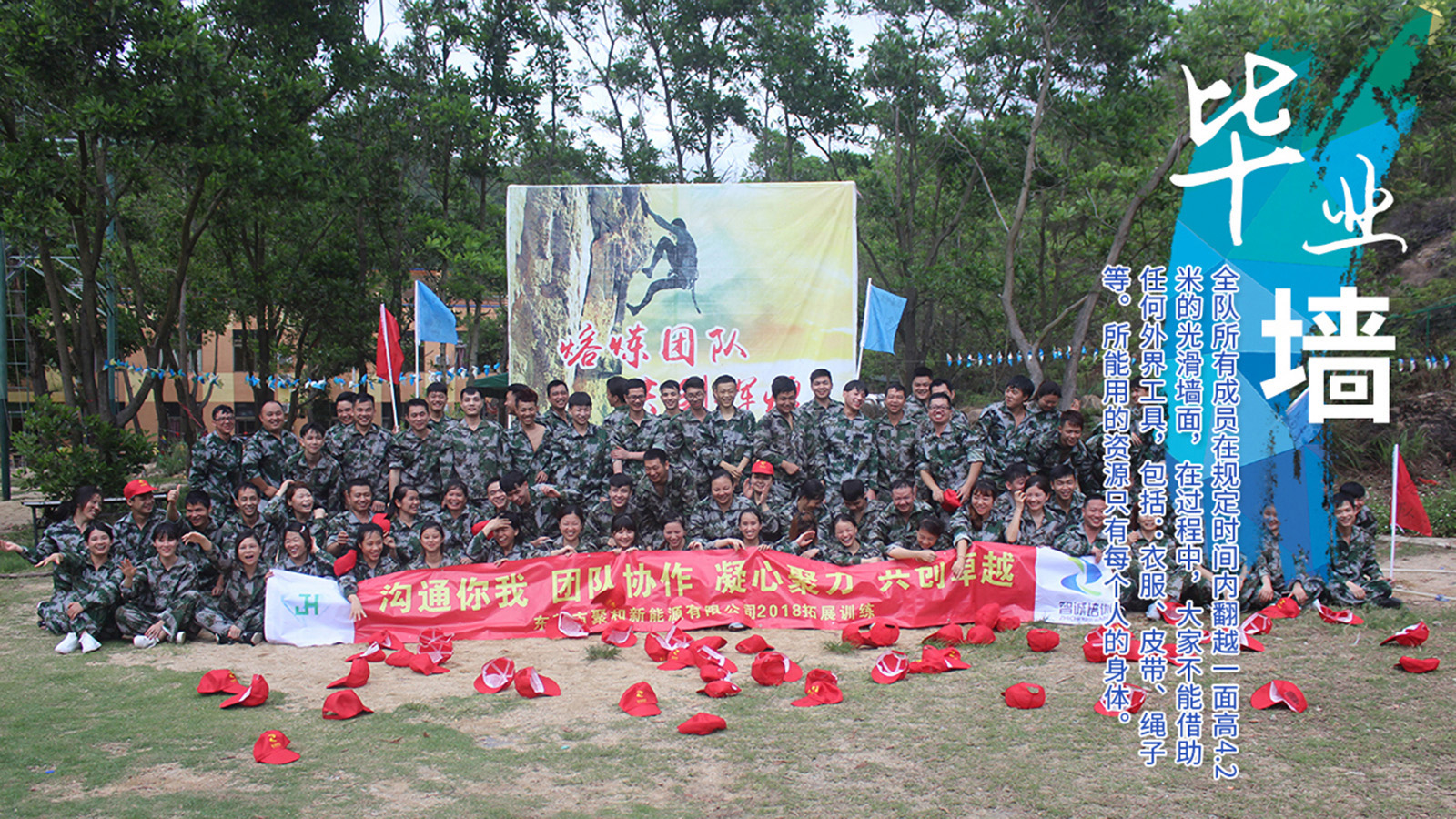所有成员在规定的时间内翻越一面高达4.2米的光滑墙面,在此过程中,大家不能借助任何外界的工具,包括:衣服、皮带、绳子等。所能用的资源只有每个人的身体。