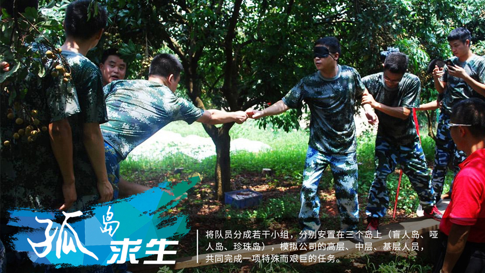 将队员分成若干小组,分别安置在三个岛上(盲人岛、哑人岛、珍珠岛),模拟公司的高层、中层、基层人员,共同完成一项特殊而艰巨的任务。