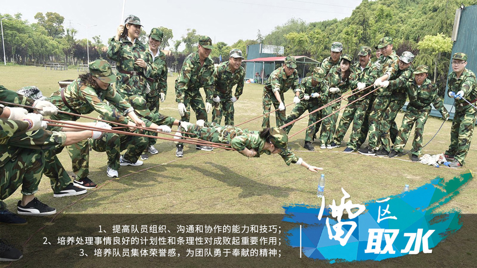 1、依体验式拓展培训:心理动力学设计,先融入、再训练,由有趣到枯燥再到刺激,逐步增加难度。