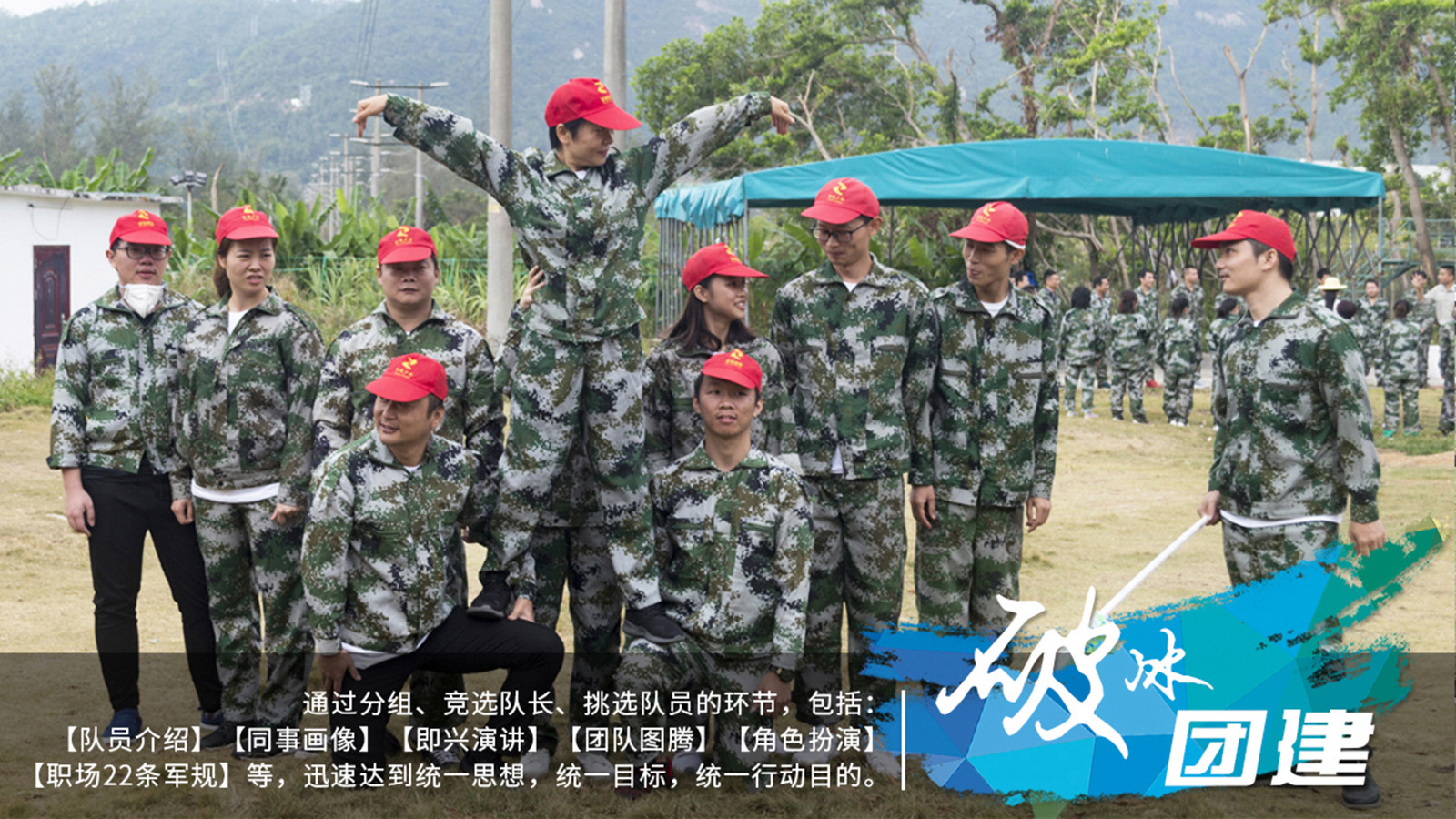 通过分组、竞选队长、挑选队员的环节,包括但不局限于【队员介绍】【同事画像】【即兴演讲】【团队图腾】【角色扮演】【职场22条军规】等,迅速达到统一思想,统一目标,统一行动的目的